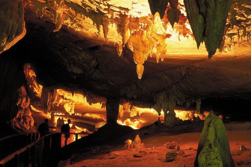 Wind Cave is so named because you can feel the flow of wind in the narrow passages of the cave. Wind Cave is part of the Clearwater Cave System. The cave features beautiful stalactites and stalagmites, some of which are illuminated, such as in the ‘King’s Room’.